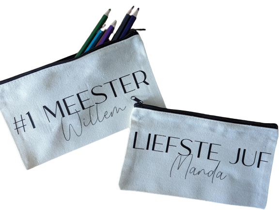 Verras de meester met een praktisch én persoonlijk cadeau: een stijlvolle katoenen etui bedrukt met zijn naam of een lieve boodschap. Ideaal voor pennen, stiften, of kleine spulletjes!