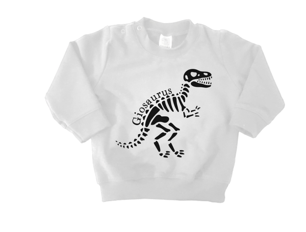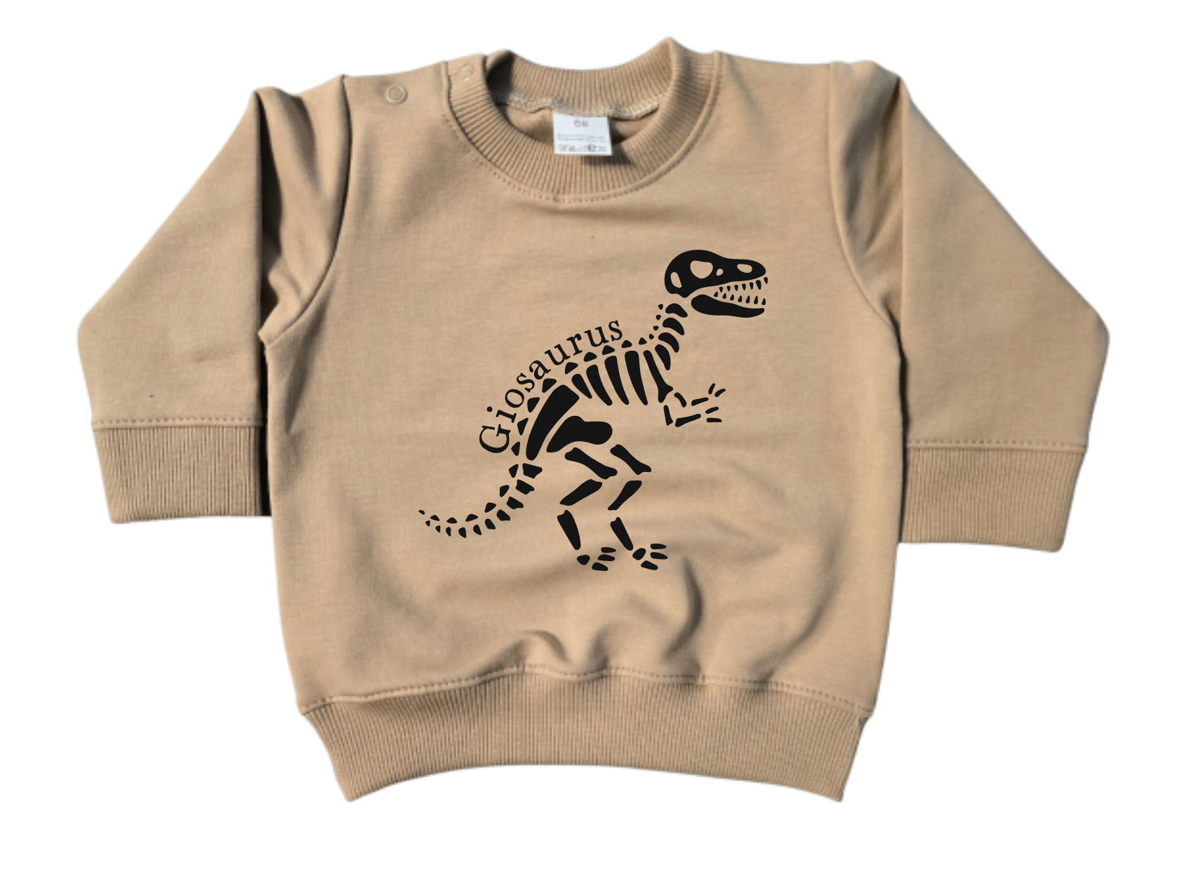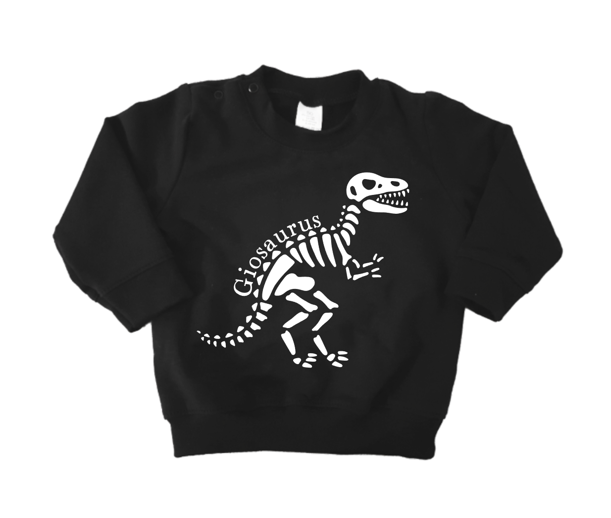 Maak kennis met de schattigste dinosaurus in de familie: jouw kleintje! Deze zachte en comfortabele baby sweater is niet zomaar een trui – hij is volledig gepersonaliseerd met een stoere dinosaurus van botten, inclusief de naam van je kind in een unieke "saurus"-stijl. Denk aan Isaacsaurus, Louisasaurus of elke andere dino-naam die jij bedenkt!
