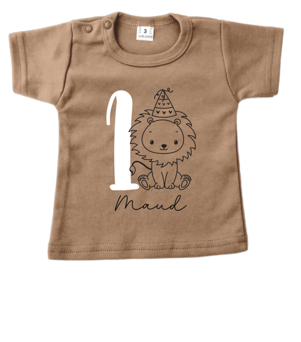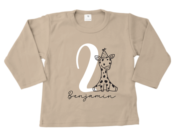 Dit shirtje is te personaliseren met naam en leeftijd van je kindje, en u kunt kiezen uit een Giraffe of Hooglander als afbeelding!