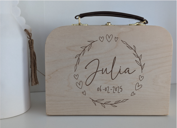 Maak elke gelegenheid bijzonder met ons gepersonaliseerde houten koffertje! Gegraveerd met een naam en geboortedatum, zorgt de lasergravure voor een gedetailleerd, tijdloos design. Kies uit verschillende ontwerpen en geef het koffertje een unieke en persoonlijke touch.